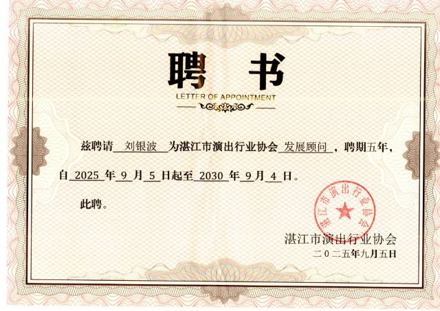 2025年4月份,湛江市演出行业协会会长陈振华为刘银波签发湛江市演出行业协会发展顾问聘书。