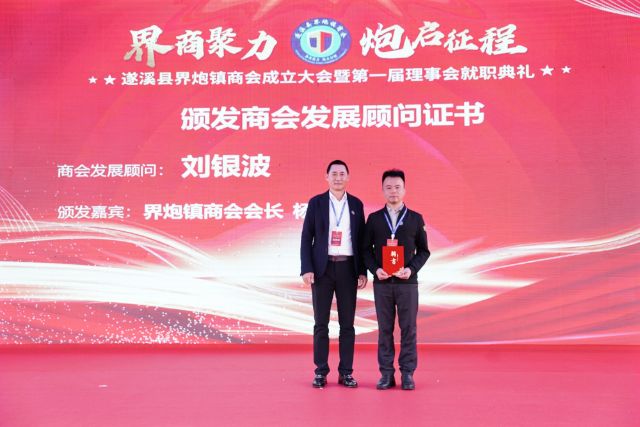 2025年4月份,遂溪县界炮镇商会会长杨季雄在商会成立仪式上为刘银波颁发遂溪县界炮镇商会发展顾问聘书。